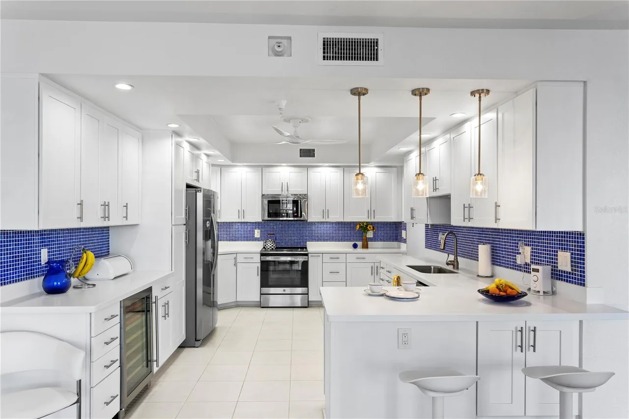 White shaker cabinetry, island seating, stainless appliances, a wine cooler, and a vivid blue tile backsplash turn the kitchen into a clear focal point.