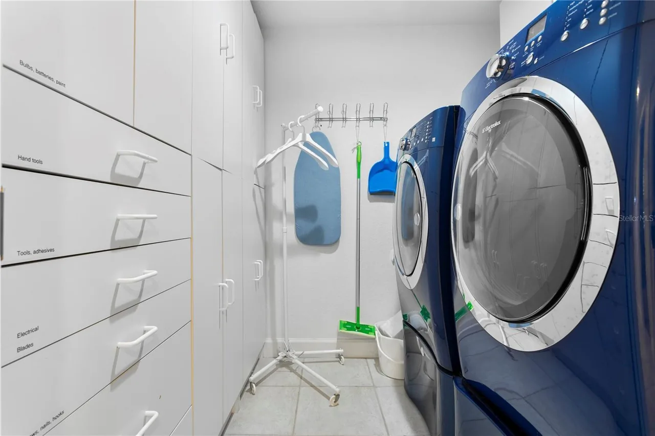 The reimagined kitchen delivers generous storage, island seating, a wine cooler, and a distinctive blue tile accent, while the guest bedroom and dedicated laundry room support seasonal stays or full-time living with ease.