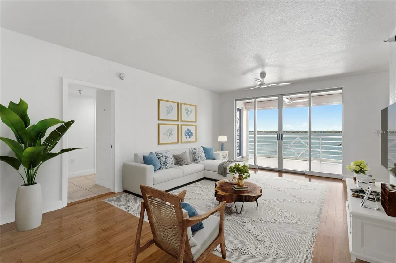The living room, dining area, and veranda are oriented toward broad Boca Ciega Bay views that give the home its strongest sense of place.